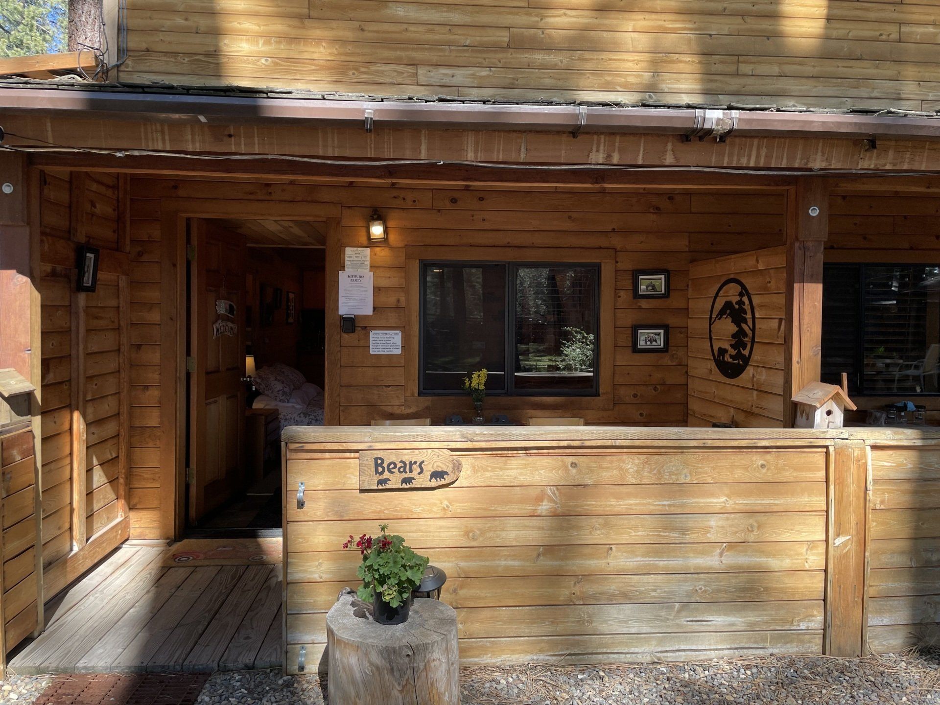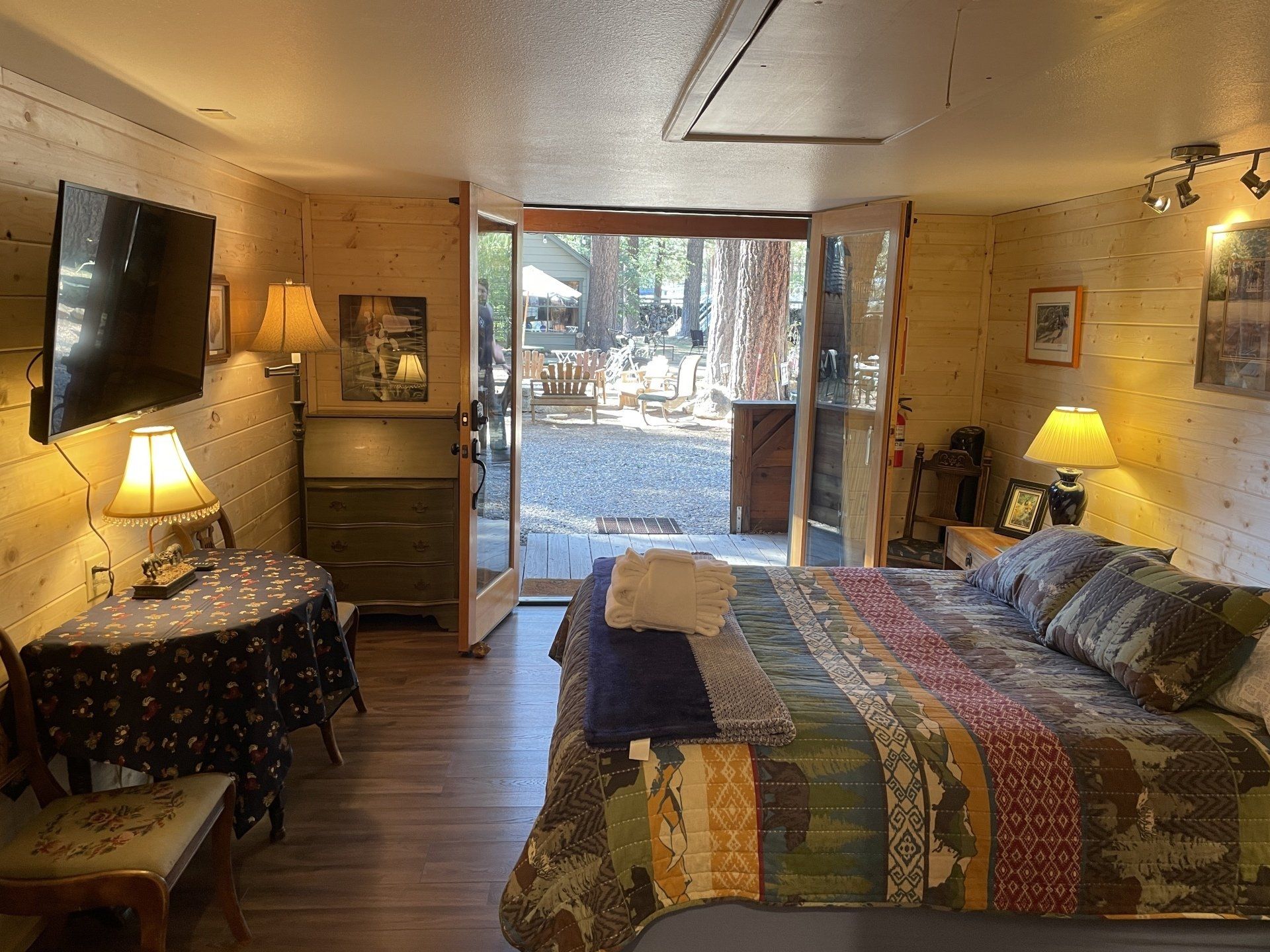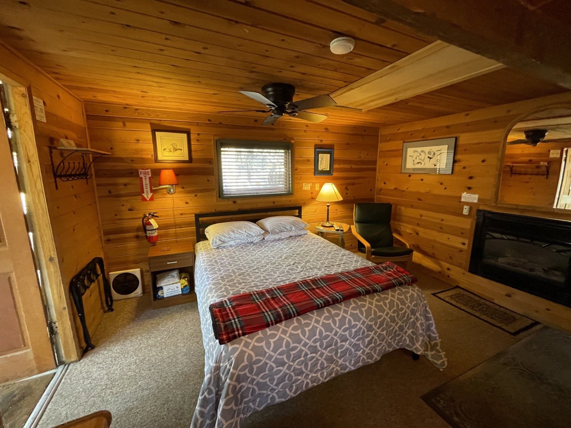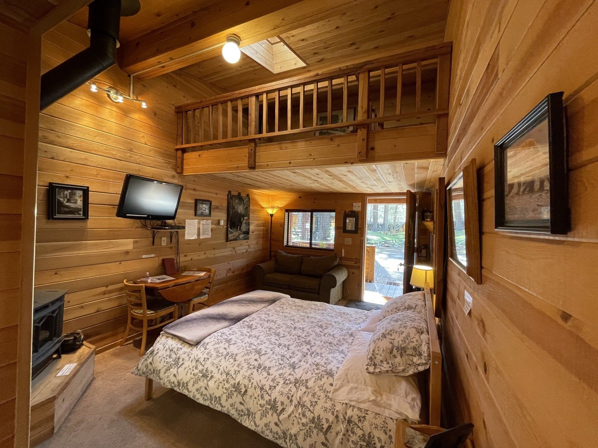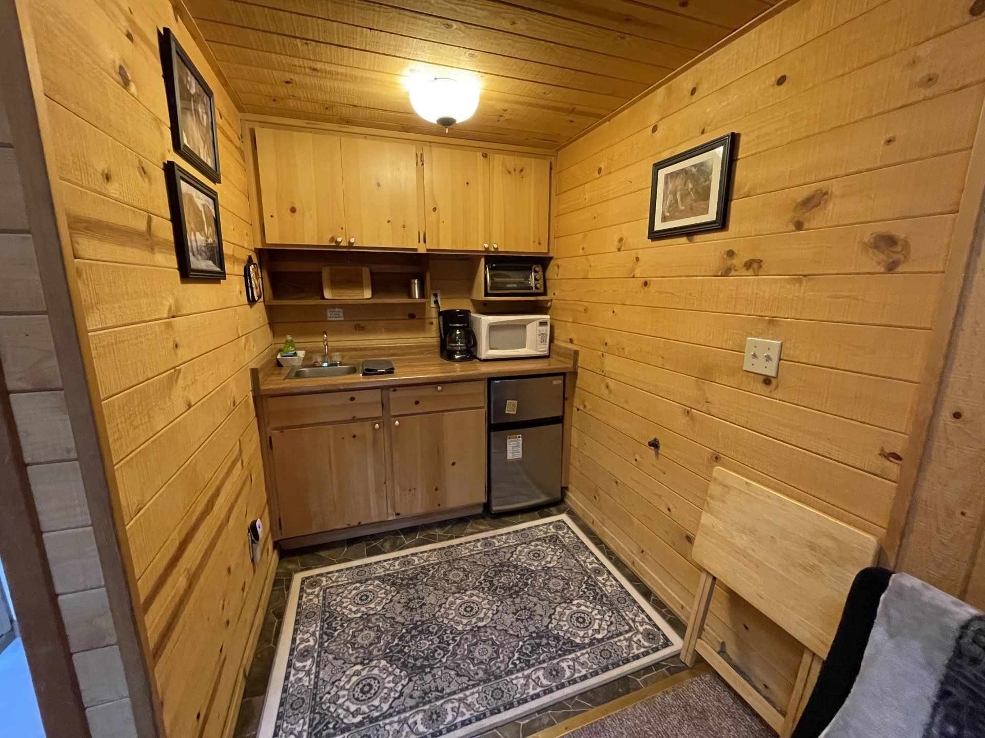 The Bears Den is a cozy duplex-style studio with a private patio and view of the grounds. The room includes a queen size bed, gas fireplace, bathroom with standup shower, Smart HDTV, and a kitchenette equipped with a sink, microwave, mini fridge, and coffee maker. The private patio has a small sitting area with table and chairs - the perfect place to drink coffee or wine! This is our most popular room!