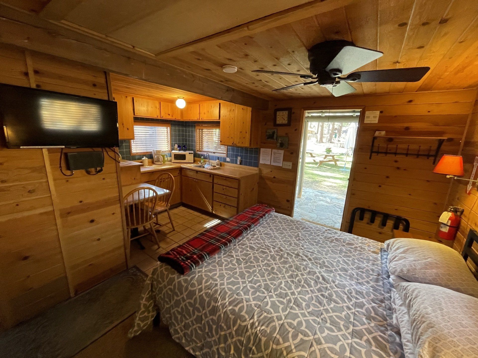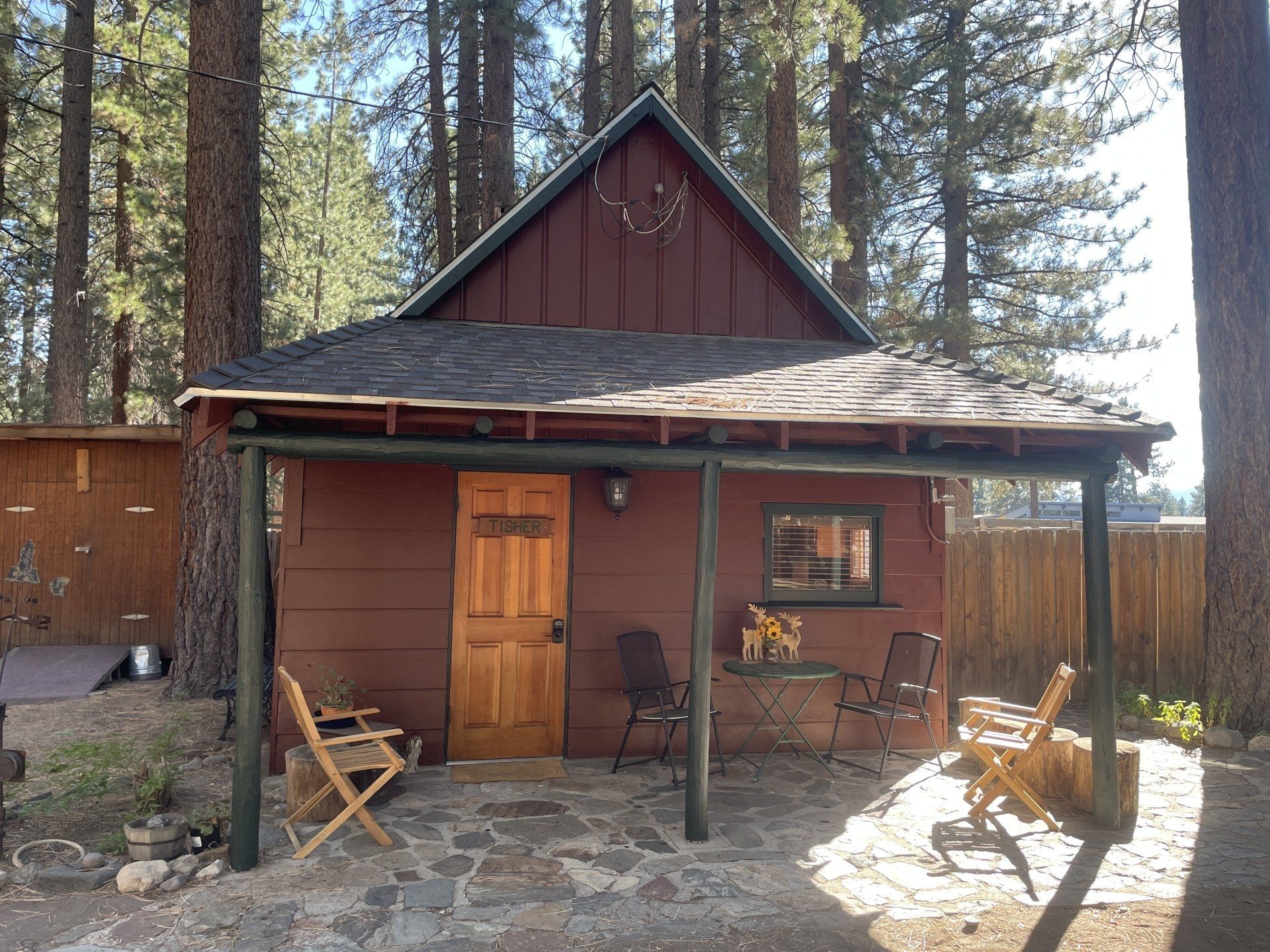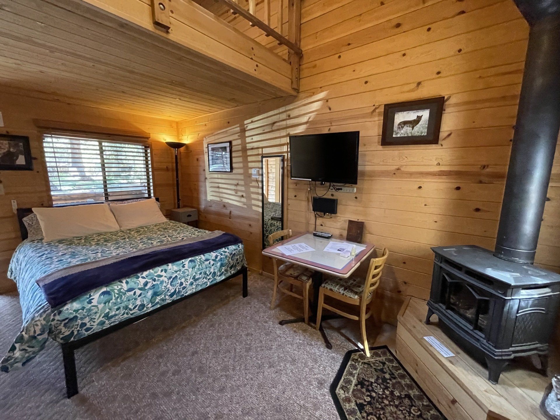 The Tisher is a rustic stand-alone cabin nestled in the pines with a comfortable open air patio. Inside the cabin is a queen size bed, gas-lit wall fireplace, bathroom with standup shower, Smart HDTV, and a kitchenette equipped with a sink, microwave, mini fridge, and coffee maker. Sitting area inside includes a comfortable reading chair, table with two chairs in the kitchenette and a couple chairs on the outside patio.