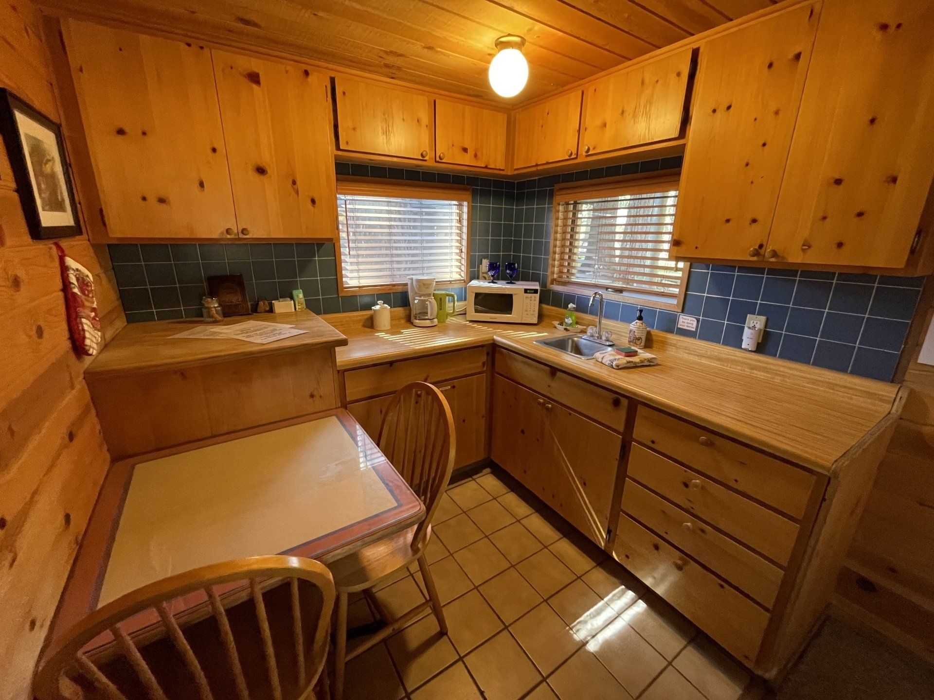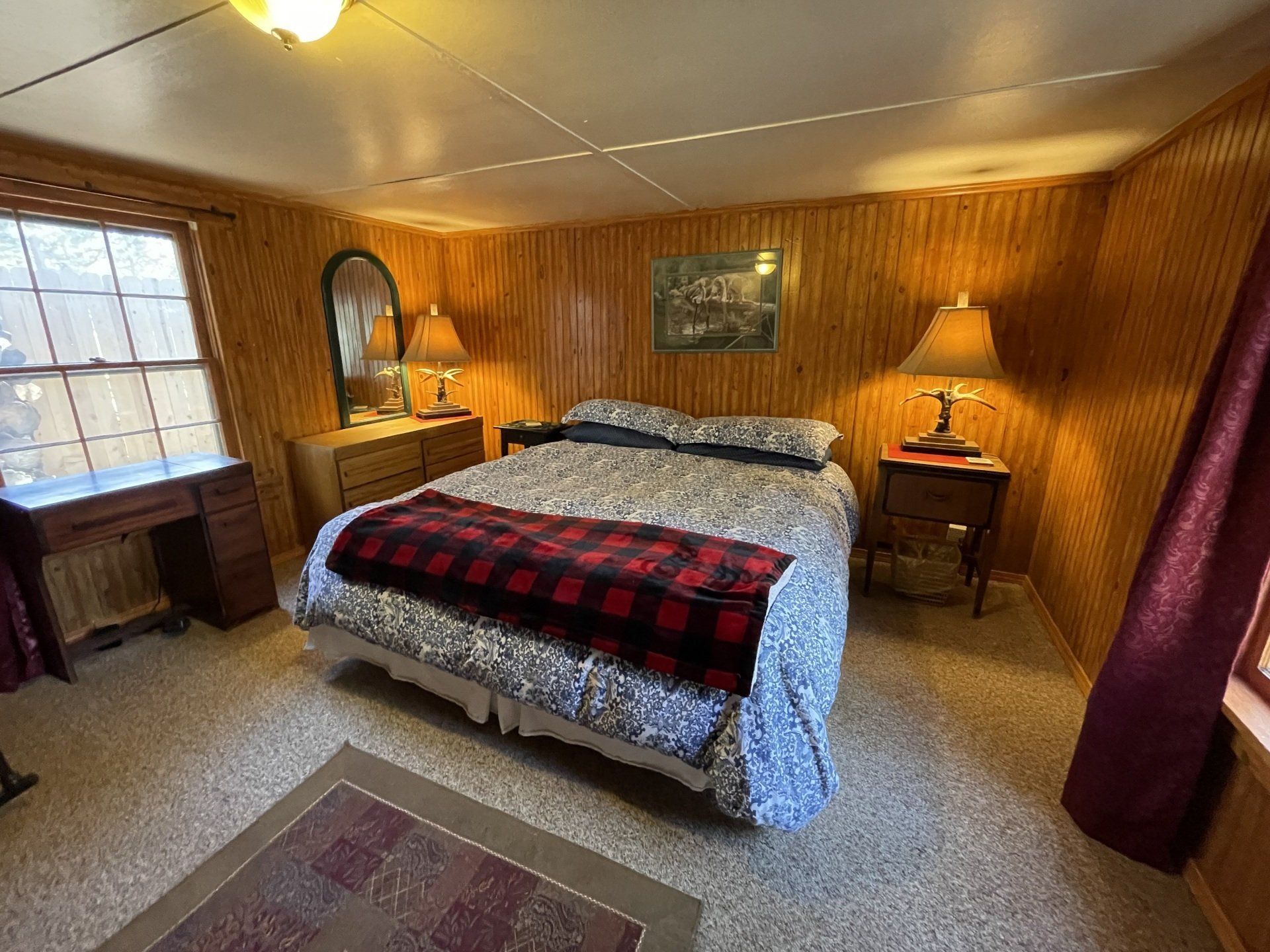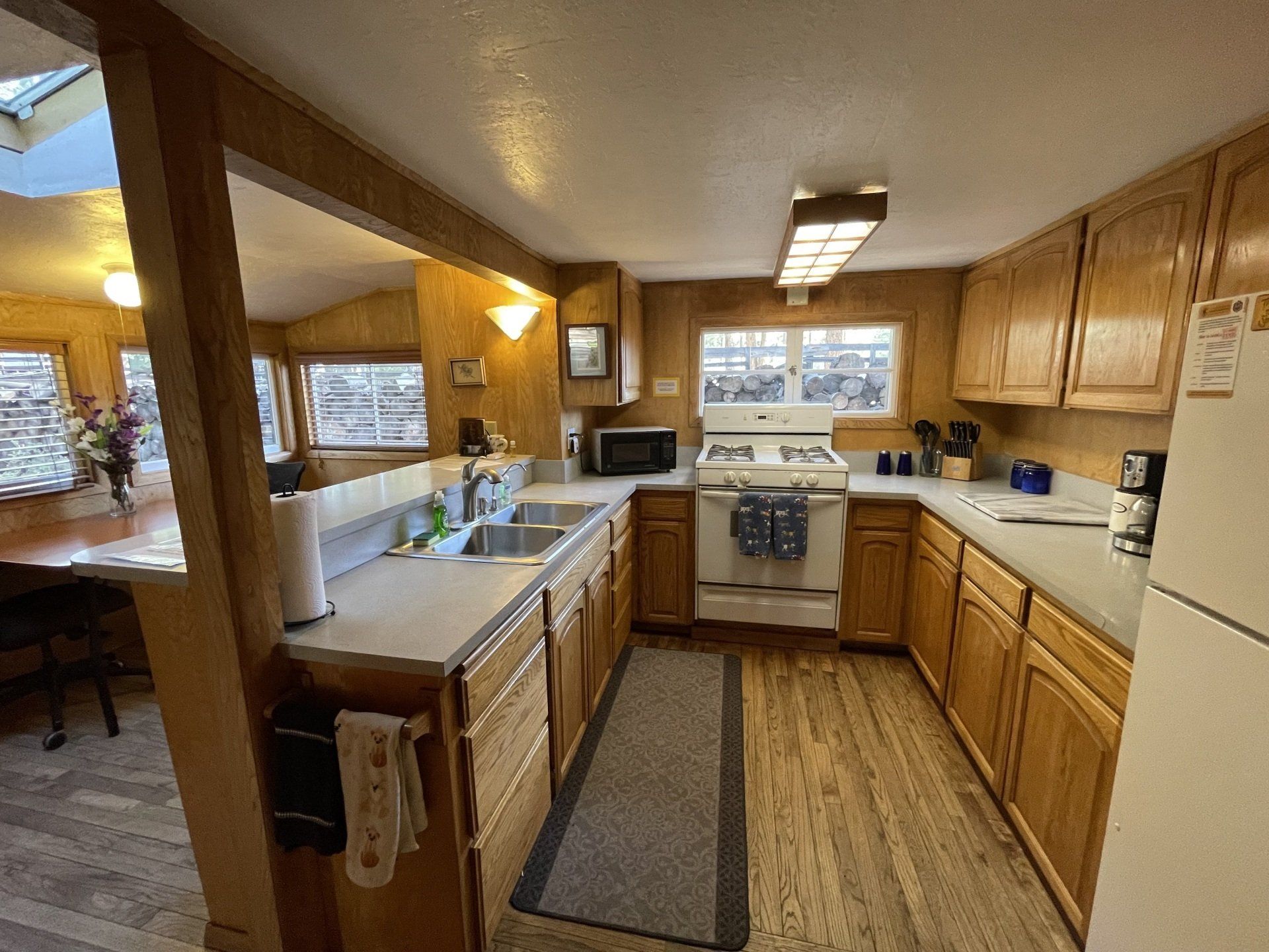The Tall Pines is a comfortable house with three bedrooms, a full kitchen, living room, dining room, and a mud room in the entryway. The downstairs bedrooms have a queen size bed and a king size bed. The room upstairs has a king size bed with a skylight overhead, AC unit, heater and a sitting area. The living room has a wood-burning fireplace, Smart HDTV, and plenty of seating with a fold-out sofa that sleeps two guests. The kitchen contains a stove, oven, full-size fridge, sink, tea kettle, coffee maker, and microwave. Washer and dryer available in the house (supplies not included). Private gas BBQ included. The Tall Pines house accommodates up to eight guests.