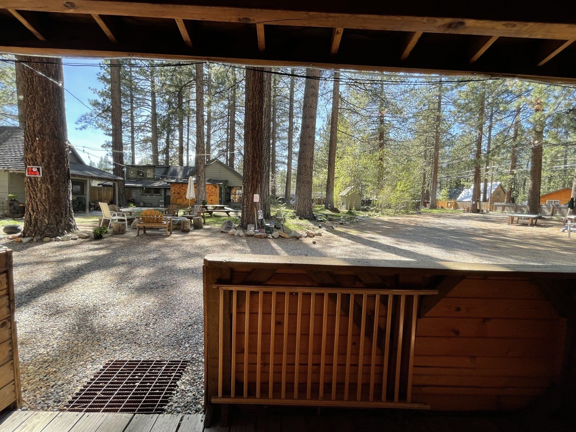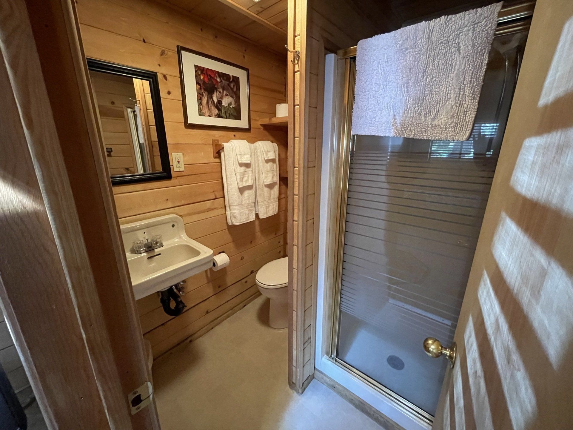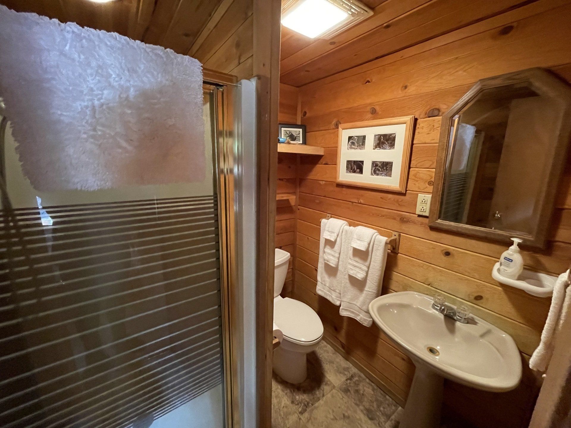 The Tall Pines is a comfortable house with three bedrooms, a full kitchen, living room, dining room, and a mud room in the entryway. The downstairs bedrooms have a queen size bed and a king size bed. The room upstairs has a king size bed with a skylight overhead, AC unit, heater and a sitting area. The living room has a wood-burning fireplace, Smart HDTV, and plenty of seating with a fold-out sofa that sleeps two guests. The kitchen contains a stove, oven, full-size fridge, sink, tea kettle, coffee maker, and microwave. Washer and dryer available in the house (supplies not included). Private gas BBQ included. The Tall Pines house accommodates up to eight guests.